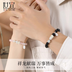 999纯银手链一对情侣款生肖龙本命年黑曜石手串粉水晶龙新年礼物