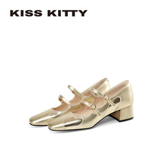 KISSKITTY玛丽珍女2026春季新款粗高跟金色方头jk学院风浅口单鞋