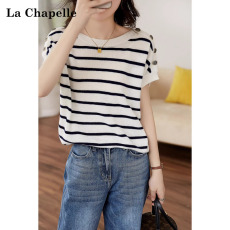 拉夏贝尔冰丝针织polo领条纹短袖T恤女夏季新款修身洋气减龄上衣