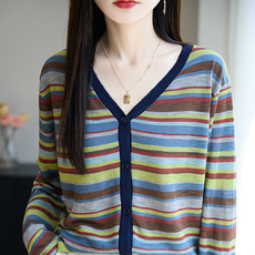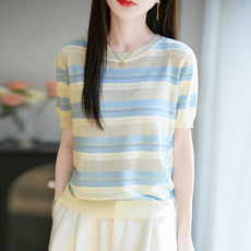 夏季时尚彩色条纹短袖t恤女减龄显白圆领针织衫冰丝半袖薄款上衣