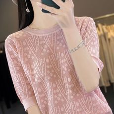 蓝色镂空提花冰丝针织短袖t恤女夏季薄款设计感圆领正肩显瘦上衣
