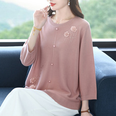 中年妈妈初秋冰丝针织衫薄加肥加大码女装宽松立体花朵桑蚕丝上衣