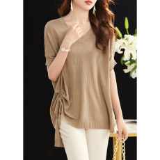 鄂尔多斯市夏季桑蚕丝短袖T恤女士薄款时尚v领洋气冰丝针织衫上衣