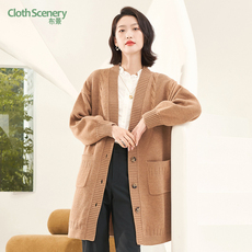 布景毛衣外套女秋季简约气质V领长袖宽松中长款羊毛针织开衫1826
