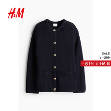 HM女装毛针织衫冬季圆领休闲宽松长袖中长款开衫1242243
