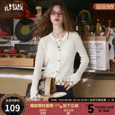 妖精的口袋白色棋盘格拼接针织衫女2025秋季新款修身薄款长袖开衫