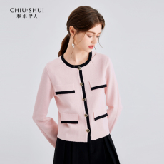 春秋装新款明星同款针织开衫女上衣撞色搭配百褶裙子白色短外套