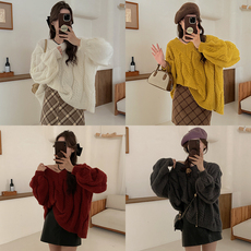 荒荒家麻花圆领毛衣2025冬季新款韩版宽松纯色简约套头针织上衣女