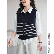 韩版两粒扣条纹针织套头马甲女秋季新款宽松叠穿无袖毛衣背心上衣