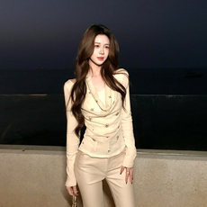 你的鱼 海盐铃兰 韩系微胖mm针织抽褶露肩修身显瘦春夏休闲套装