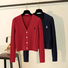 早秋新品刺绣小马洋气麻花针织开衫女士短款外套V领修身外搭上衣