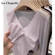 拉夏贝尔浅紫色防晒衣薄纱夏天配吊带裙子外搭开衫小披肩针织上衣