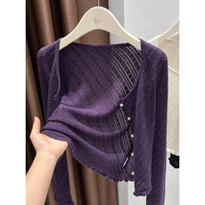 冰丝针织镂空紫色防晒开衫配裙子长袖空调衫遮阳披肩女外搭旗袍秋