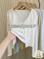 白色花边V领木耳边冰丝针织防晒空调衫夏高级感吊带外搭披肩罩衫