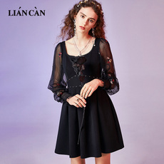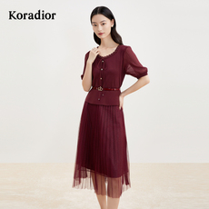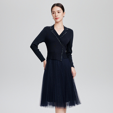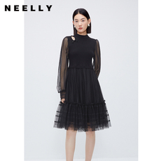 珂莱蒂尔outlets年秋季冰丝针织拼接网纱连衣裙中长款礼服女