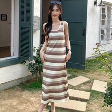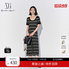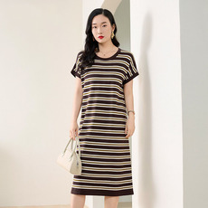 2025夏新款短袖高级感设计连衣裙女气质中长款条纹裙子显瘦针织裙