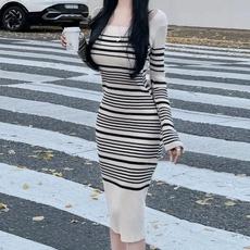 针织打底连衣裙女内搭秋冬季新款方领中长款气质毛衣长裙过膝裙子