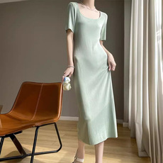 外贸春夏季新款女装 欧美休闲针织圆领修身短袖女生中长连衣裙A69