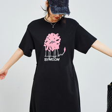 夏季女士短袖真丝中长款连衣裙三宅褶皱裙子显瘦水墨画洋气百褶裙