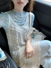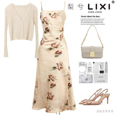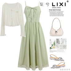 韩系冰丝针织v领镂空吊带连衣裙女春夏小个子中长款叠穿罩衫上衣