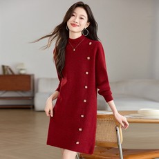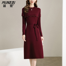 茗思纯羊毛针织连衣裙女冬2024新款红色系带显瘦过膝中长款毛衣裙