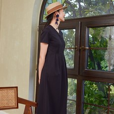木果果木2025春季新款抽绳收腰黑色中长款复古针织短袖连衣裙