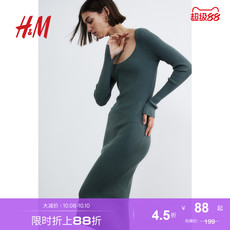 HM女装连衣裙秋季气质插肩袖罗纹针织修身中长裙1195371