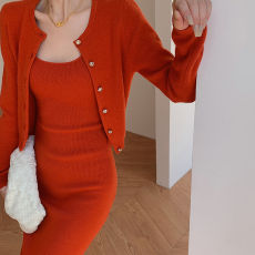 JWUNIQUE红色针织两件套装女秋季2025新款修身显瘦连衣裙开衫外套