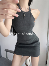 致命曲线灰色挂脖露肩针织连衣裙女设计感修身包臀裙无袖背心短裙