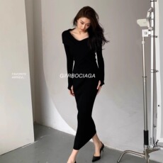 韩国chic气质V领修身针织连衣裙女春秋新款打底裙显瘦百搭长裙子