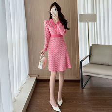 秋冬季气质名媛小香风针织连衣裙女高级感V领高腰A字提花毛衣