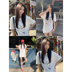 ROCKMORE【紫荆花开】印花撞色一字肩长袖T恤 不规则下摆针织上衣