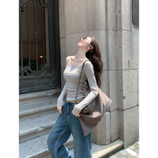 MULVAN 方领针织长袖t恤女秋季新款设计感收腰修身显瘦内搭上衣
