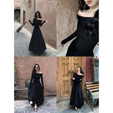 pusumede 日落赴约 黑色斜肩长袖T恤女简约露肩内搭显瘦针织上衣