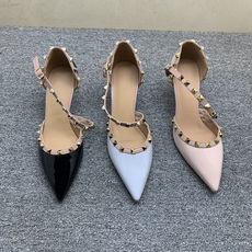 2025新款尖头浅口铆钉漆皮一字扣带单鞋包头凉鞋女性感细跟高跟鞋