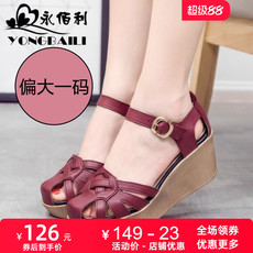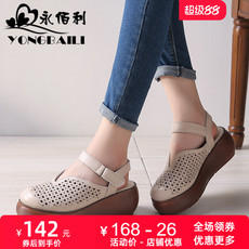 2025夏季新款时尚真皮休闲凉鞋女厚底坡跟镂空透气软底女鞋皮鞋