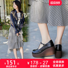 2025春新品复古文艺镂空羊皮单鞋女厚底高跟扣带休闲女鞋皮鞋潮