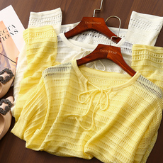 欧洲站2026春季新款领口系带V领百搭显瘦针织衫薄款镂空微透毛衣