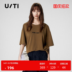 U/TI咖色印花镂空透气T恤女装 百搭简约短袖休闲尤缇时尚夏季新款