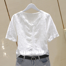 欧美出口单夏季纯棉肩膀刺绣镂空白色短袖T恤简约百搭全棉上衣女
