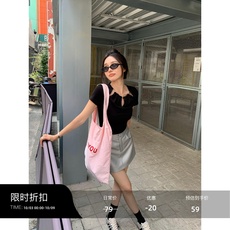 正肩短袖t恤女夏季新款韩系甜美镂空多巴胺撞色修身短款黄色上衣