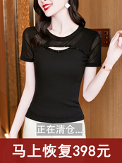 冰丝针织短袖薄款T恤女夏季欧货正肩轻奢高级感法式镂空短款上衣