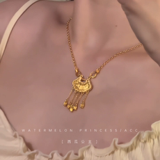 古法花丝如意流苏锁包吊坠项链女黄金色新中式百合花长命锁毛衣链