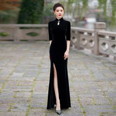 黑色金丝绒走秀旗袍修身显瘦七分袖长款晚礼服中老年形体演出服冬