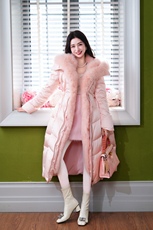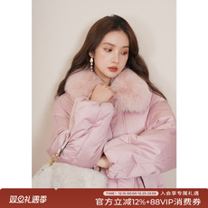 竹依依粉色狐狸大毛领90鸭绒羽绒服女冬季中长款过膝加厚保暖外套