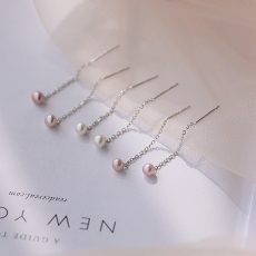 925纯银天然淡水珍珠粉耳环耳钩 正圆长款耳线时尚耳坠耳饰送女友
