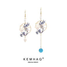 蓝色凤凰耳环古风不对称长款流苏气质超仙纯银耳钩蚊香盘耳夹女
