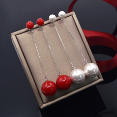S925纯银珍珠耳环无耳洞耳夹韩国长款大红色新娘耳坠女简约气质耳