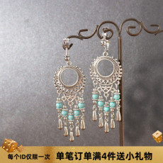蓝松石纯银耳环度假风复古做旧古银气质耳饰长款流苏无耳洞耳夹女