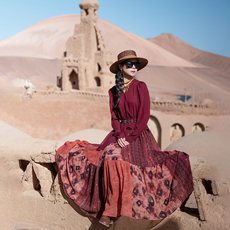 理想三旬女装复古波西风酒红色不规则下摆雪纺衫长袖衬衫短上衣